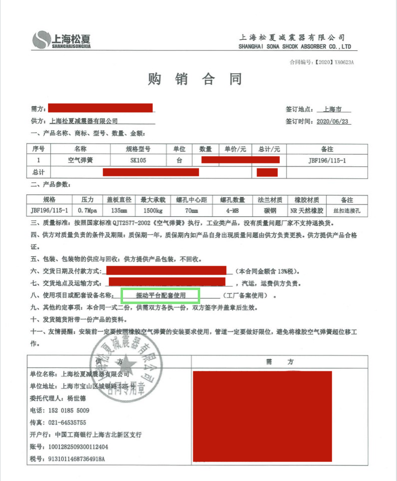 上海松夏减震器有限公司官方网站为您介绍:【震动平台配套】使用上海松夏JBF196/115-1采购合同信息,我们松夏公司2020年为【震动平台配套】使用上海松夏JBF196/115-1,起到了减震和降噪的作用,以下是【震动平台配套】使用上海松夏JBF196/115-1采购合同介绍