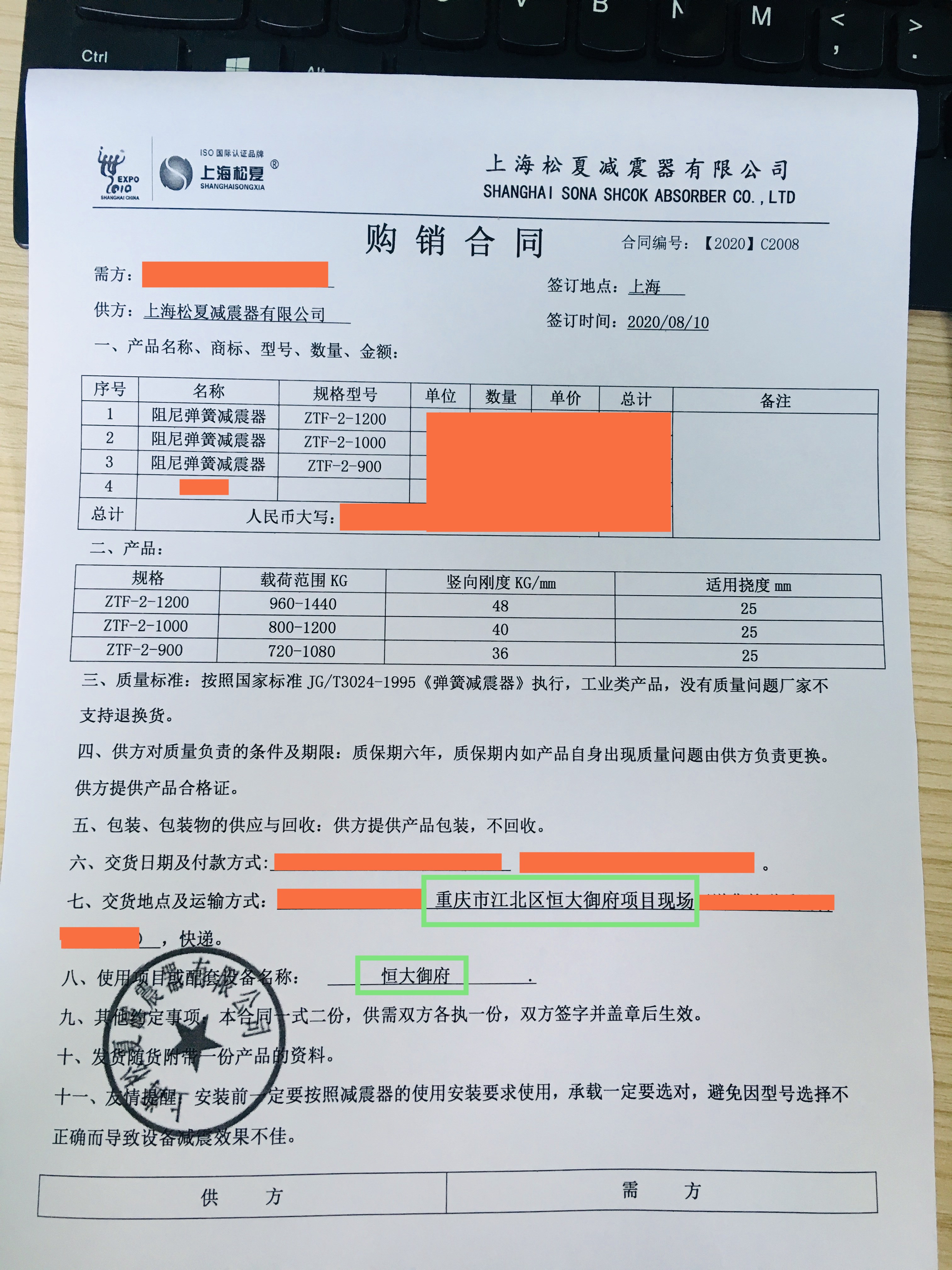 上海松夏减震器有限公司官方网站为您介绍:【恒大御府配套】上海松夏阻尼弹簧减震器采购合同信息,我们松夏公司2020年为【恒大御府配套】上海松夏阻尼弹簧减震器,起到了减震和降噪的作用,以下是【恒大御府配套】上海松夏阻尼弹簧减震器采购合同介绍。